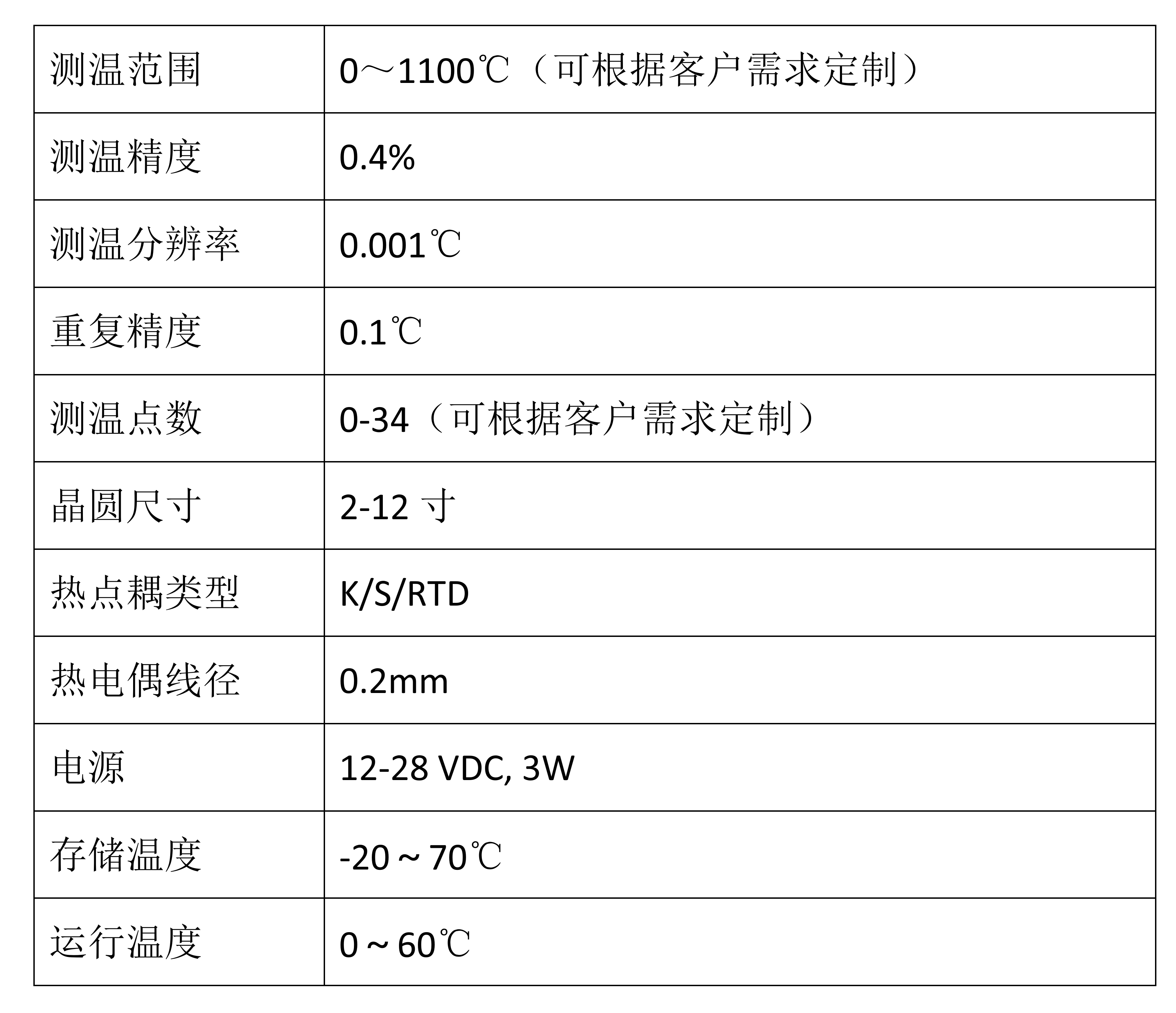 TC Wafer是直接鑲嵌于晶圓表面的溫度傳感器,可以實現(xiàn)晶圓表面溫度的實時測量。借助于放置在晶圓表面特定位置之間的溫度傳感器,可獲得這些特定位置的真實溫度測量值以及整片晶圓溫度分布;同時也可利用此傳感器來持續(xù)監(jiān)控在熱處理工程中晶圓暫態(tài)溫度變化,例如:升溫,降溫過程及延遲周期等。